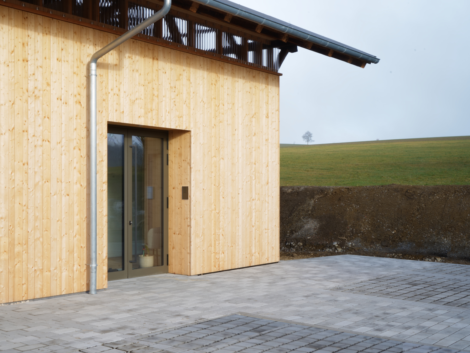 Der neue Einbau wurde konsequent als Holzbau umgesetzt. Vorgefertigte Wandelemente und eine klassische Deckenbalkenkonstruktion ermöglichten eine präzise Ausführung, kurze Bauzeiten und minimale Eingriffe in den Bestand. Holz fungiert dabei nicht nur als tragender Baustoff, sondern prägt auch Atmosphäre, Akustik und Raumwahrnehmung im Inneren. Die Nachhaltigkeit bei diesem Projekt ergibt sich unmittelbar aus dem gewählten Umgang mit dem Bestand. Der vollständige Erhalt der Tragstruktur vermeidet Abbruchabfälle, reduziert den Materialeinsatz und spart einen erheblichen Anteil grauer Energie sowie CO₂-Emissionen ein. Der innere Neubau ist so ausgeführt, dass er auch in Zukunft vielfältige Nutzungsänderungen zulässt und auch rückstandfrei wieder ausbaubar ist. Die Außenanlagen beschränken sich auf das Notwendige, minimieren versiegelte Flächen und fördern Versickerung und Verdunstung.