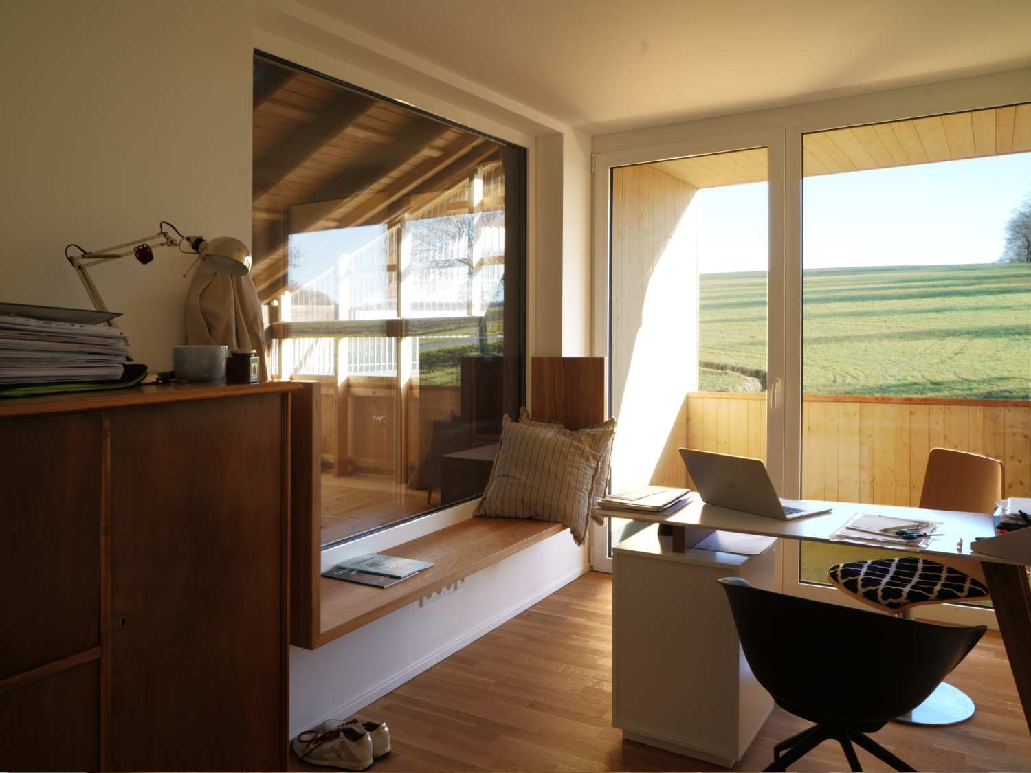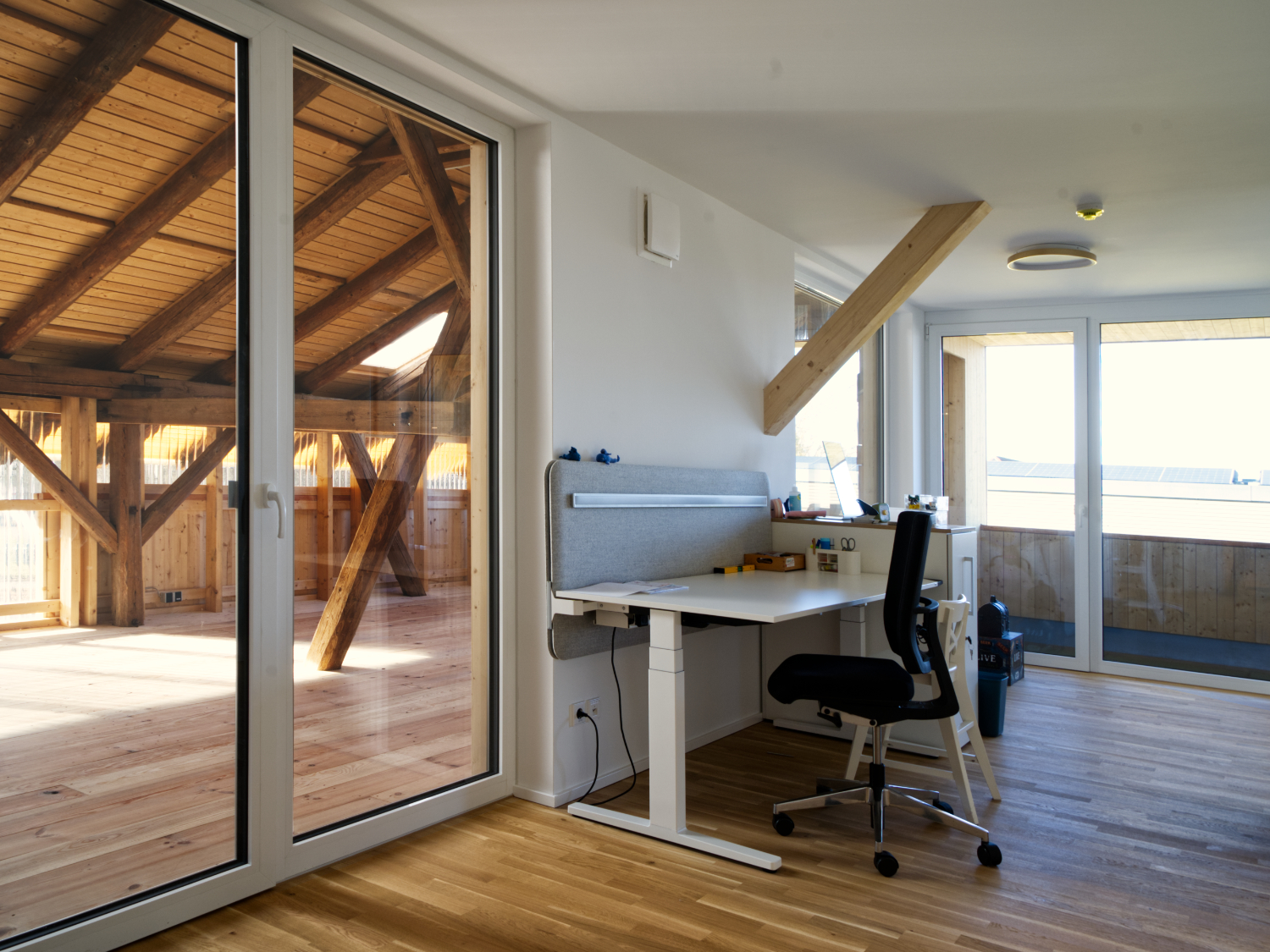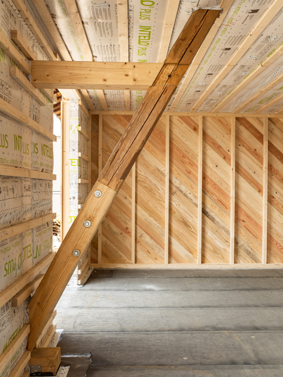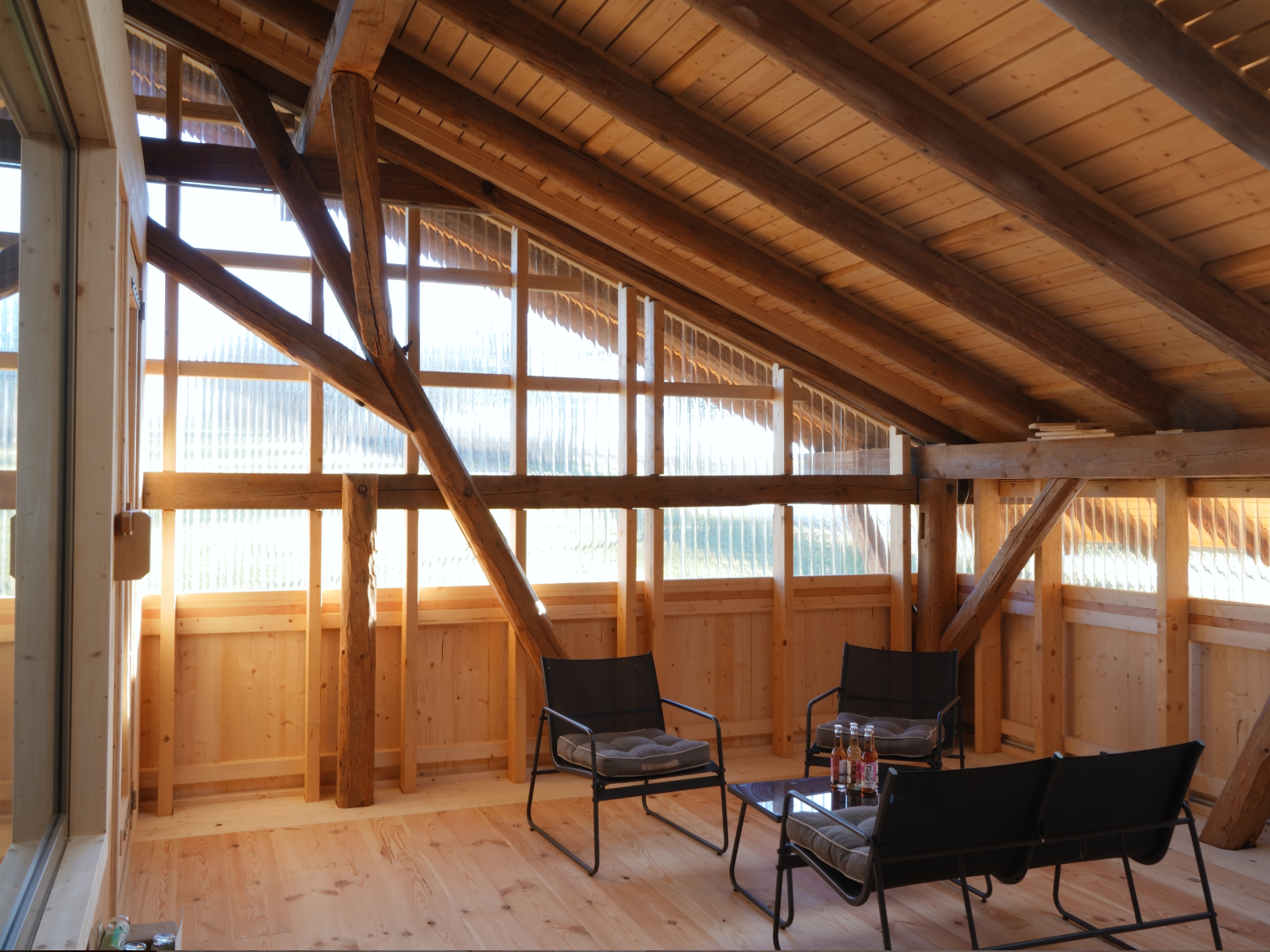 Dieses Prinzip ermöglicht einen differenzierten Umgang mit Alt und Neu. Im Erdgeschoss durchdringen gezielte Öffnungen für Licht, Luft und Erschließung die bestehende Struktur und verbinden das neue Innere mit dem Äußeren direkt. Im Obergeschoss entsteht zwischen äußerer Hülle und innerem Neubau ein unbeheizter, wettergeschützter Zwischenraum. Dieser Bereich erweitert das Nutzungsspektrum jenseits der thermischen Hülle, bietet Aufenthaltsqualität und inszeniert das Spiel zwischen historischem Holzbau und neuem Einbau.