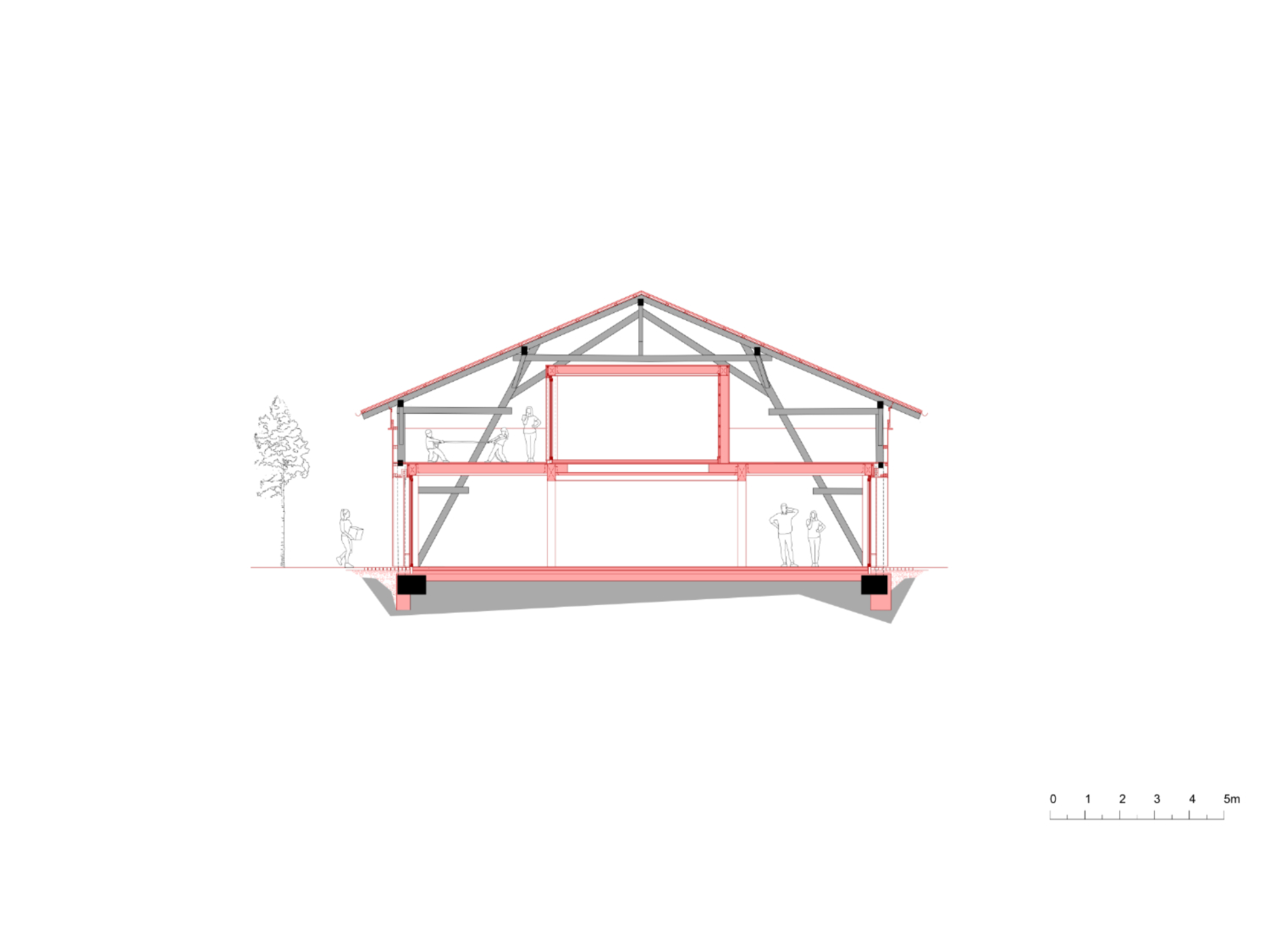 Konstruktiv blieb die bestehende Holztragstruktur vollständig erhalten. Auch die historischen Punktfundamente konnten bewahrt und in eine neue Bodenplatte integriert werden. Wo erforderlich, wurde das Tragwerk behutsam instandgesetzt und statisch ertüchtigt, ohne seine ursprüngliche Logik zu verändern. Dachhaut und Fassadenbekleidung wurden unabhängig von der Tragstruktur erneuert. Ein umlaufendes Lichtband im oberen Fassadenbereich sorgt für eine gleichmäßige Belichtung und natürliche Belüftung der Zwischenzone sowie der dahinterliegenden Therapieräume.